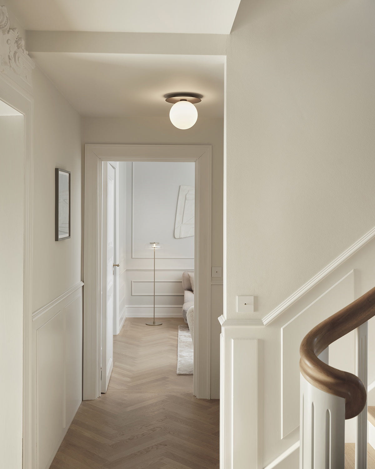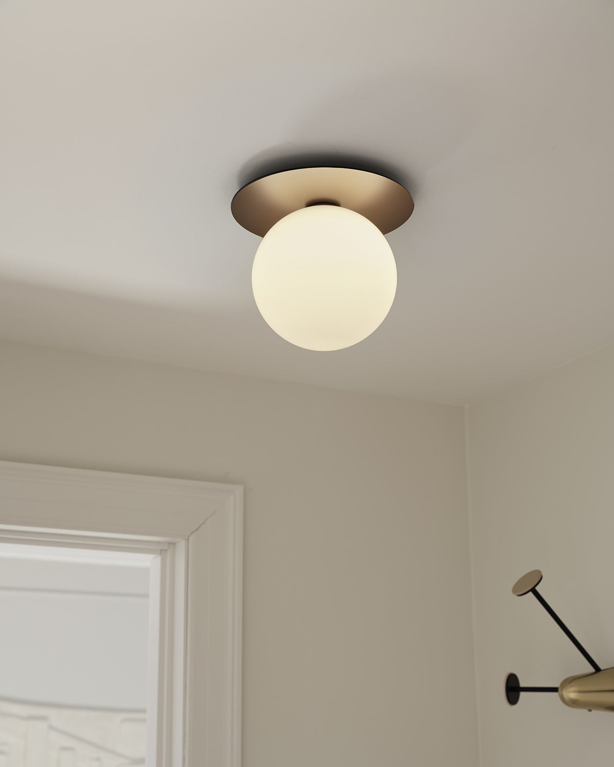 Liila 1 Large er en enkel væg- og loftslampe med god lysspredning, der giver et behageligt og effektivt lys. En tynd metalskive i mørk bronze finish dækker bagpladen, mens en stor mundblæst glaskugle i opalhvid skaber blikfanget og spreder et blødt, behageligt lys. Liila 1 Large er velegnet til entreen, mindre rum samt rum med lavt til loftet, og er ligeledes godkendt til montering på badeværelset.