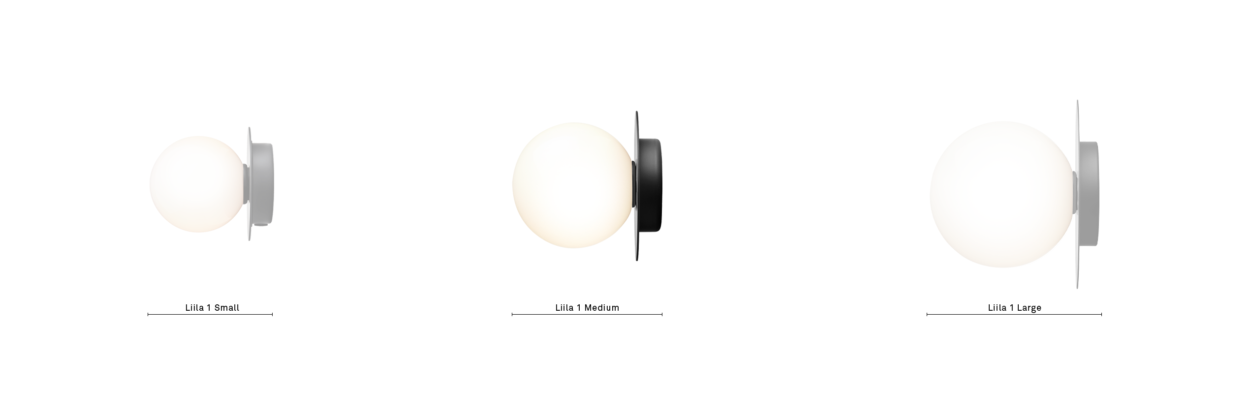 Liila 1 Medium er en enkelt lampe, der fungerer både som væg- eller loftlampe. Lampen er enkel i sin form, bestående af en tynd, rund metalplade i mørk bronzefinish. En mundblæst opalhvid glaskugle kaster et blødt, omgivende lys og giver lampen et svævende udseende. Liila 1 Medium er velegnet i mindre rum eller rum med lavthængende lofter, hvor en lampe i ledning måske ikke vil fungere.