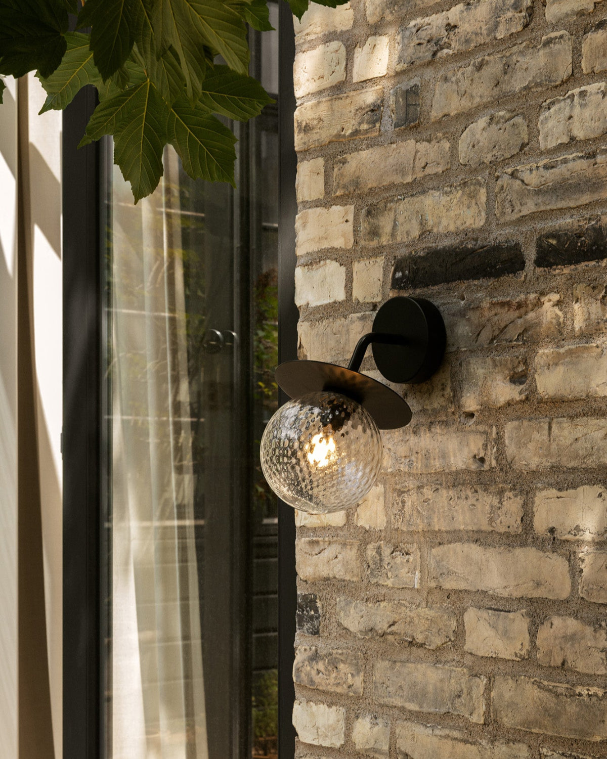 Liila Wall Outdoor er en ny tilføjelse til Liila kollektionen. Lampen er designet til at blive placeret udendørs og kan med fordel installeres på begge sider af en hoveddør for at skabe et harmonisk look. Liila Wall Outdoor har en metalkrop i sort pulverlakering og en mundblæst glaskugle i optisk klart glas. En tynd, rund plade i metal er fastgjort til den bøjede lampearm, og er placeret bag en optisk klar glaskugle, hvilket skaber en legende lyseffekt samtidig med at lampen giver god belysning udendørs.