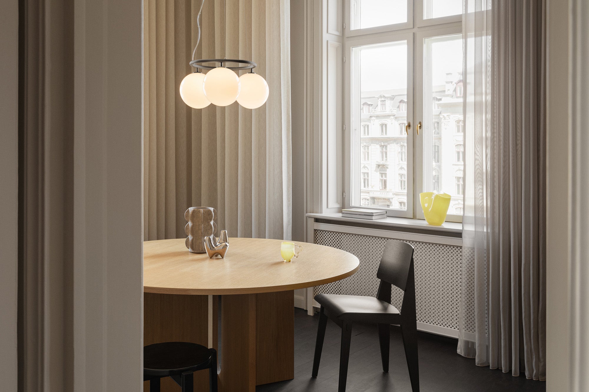 Miira 3 Circular er den seneste tilføjelse til Circular-serien og er særligt velegnet i mindre rum, hvor der er begrænset plads, men hvor man stadig ønsker lysekrone-udtrykket. Den enkle metalring har en diameter på blot Ø54 cm og er udført i mørk bronze pulverlakering. 3 store mundblæste skærme i opalhvidt glas er monteret på metalringen, og eksemplificerer moderne design gennem sin grafiske silhuet. Lad Miira 3 Circular lysekronen lyse hallen, stuen eller kontoret op.