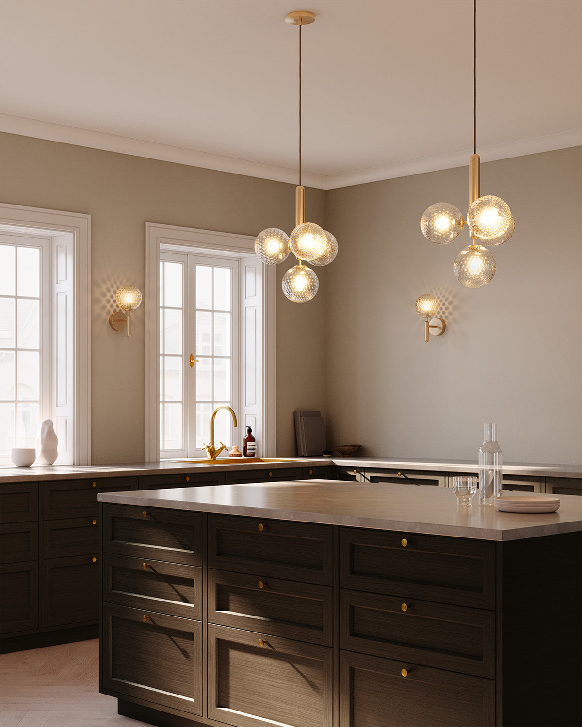 Miira 4 er en flerpendel med 4 mundblæste glaskupler. Kombinationen af messingfarvet metal og klart optisk glas skaber et moderne valg af belysning i hjemmet. Brug pendlen over køkkenøen og nyd designet og den fremragende belysning med Miira 4.