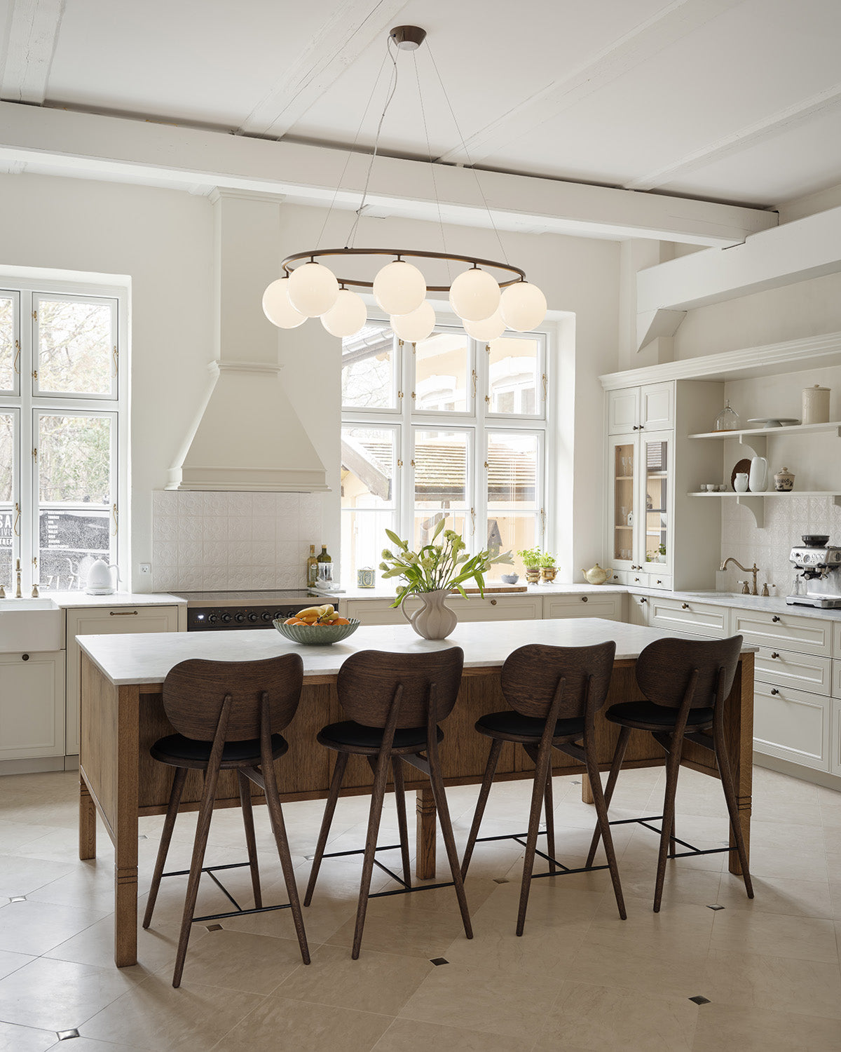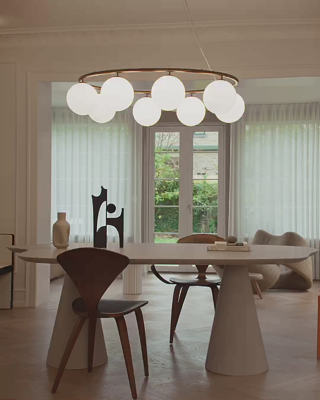 Miira 8 Oval er en moderne lysekrone i messing med et ovalt design og er inspireret af de to runde lysekroner fra samme kollektion; Miira 6 Circular og Miira 8 Circular. Lysekronen består af en metalring i anodiseret aluminium, som giver den gyldne messingfarve, samt 8 mundblæste glaskugler i opaliseret glas. Miira 8 Oval lysekronen er ideel over et stort spisebord, hvor den spreder et behageligt og stemningsfuldt lys. Lampen justeres nemt i højden ved hjælp af et særligt wire-system.