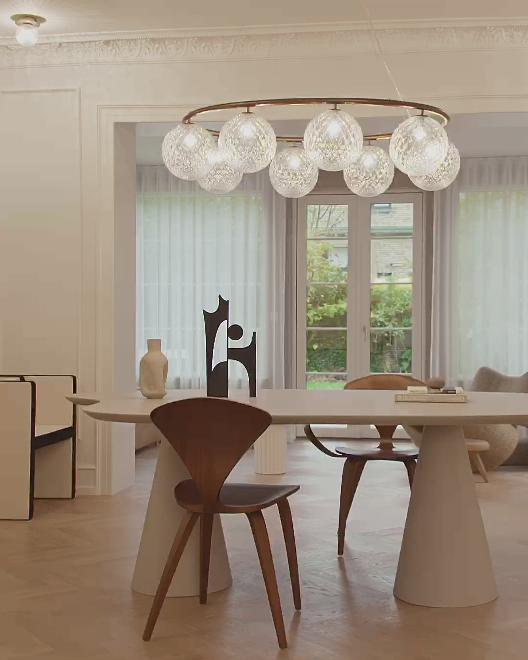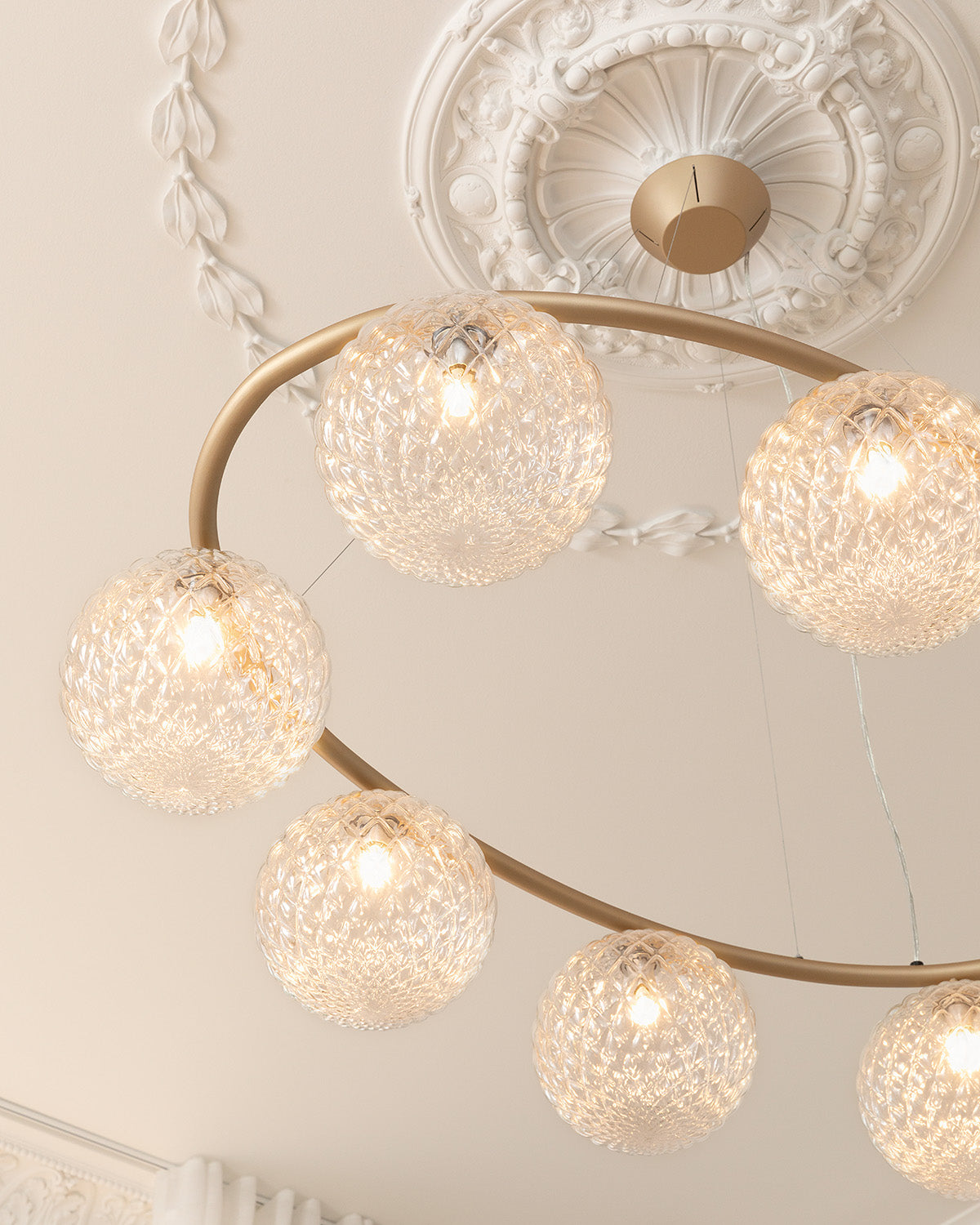 Miira 8 Oval er en moderne fortolkning af lysekronen. Denne Miira lysekrone er skabt i et enkelt design bestående af en oval metalring udført i messingfarvet anodiseret aluminium, hvorfra 8 mundblæste glas hænger. Glaskuglerne er præget med et dekorativt mønster og spreder et strålende lys til området omkring lampen. Den organiske form på Miira 8 Oval gør lysekronen velegnet som stemningsbelysning over et ovalt spisebord. Skab en sanselig og indbydende atmosfære i større rum med de moderne lysekroner fra Miira-kollektionen.