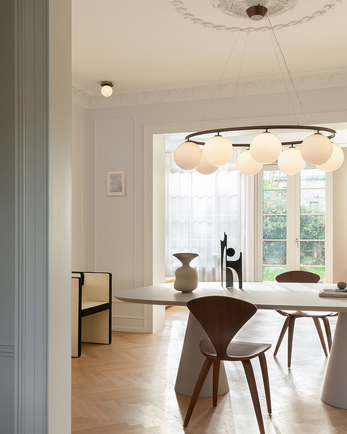 Miira 8 Oval er en moderne lysekrone, der med sin organiske form er særligt velegnet som belysning over et aflangt spisebord eller hængende over et større konferencebord. Miira 8 Oval lysekronen består af en oval metalring i mørk bronze finish, hvorpå 8 store mundblæste glaskugler i opalhvid er monteret og spreder et godt og behageligt kvalitetslys. Lysekronens wire-system gør det nemt at justere hvor lavt eller højt fra loftet, lampen skal hænge.