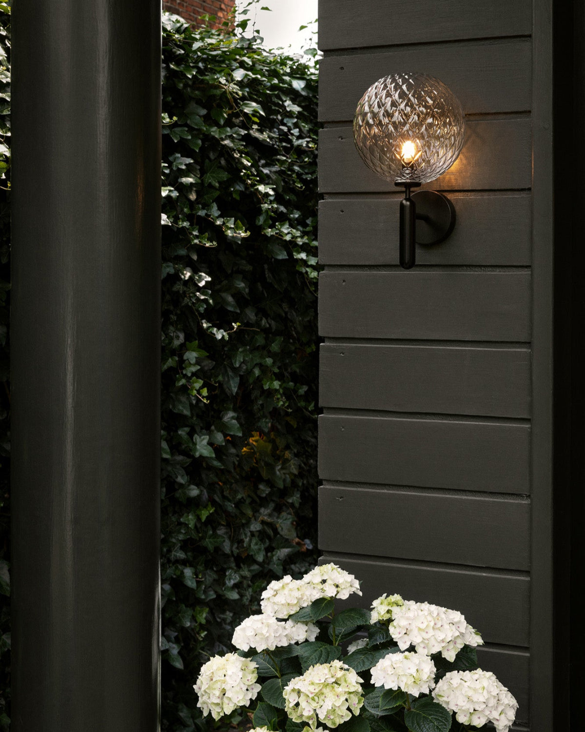 Miira Wall Outdoor er designet til at oplyse hjemmets ydre omgivelser. Denne udendørs væglampe er inspireret af væglampen fra vores Miira-kollektion og er skabt med sort metalbeslag og en stor, optisk klar glaskugle som omdrejningspunkt. Dette giver et legende lys og en levende glød. Miira Wall Outdoor tilfører elegance og funktion til husets udendørsområder.