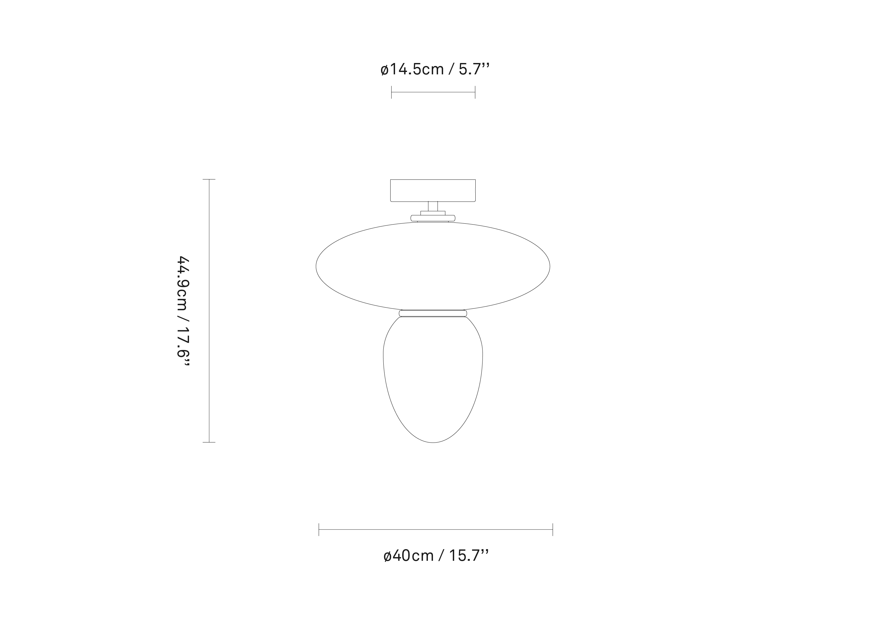 Rizzatto 42 er en semi-flush monteret lampe, der kombinerer rene, organiske former og geometriske figurer. Fra en specialfremstillet metalbaldakin i satin sølvfinish er en elliptisk glasskærm i opalhvid fastgjort, som spreder et blødt lys ned i den ovale nedre glasskærm. Rizzatto 42 loftlampen skaber diffust lys i rummet og er velegnet i rum, hvor en dekorativ loftlampe ønskes.