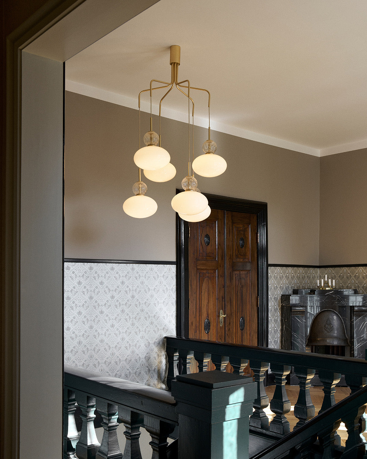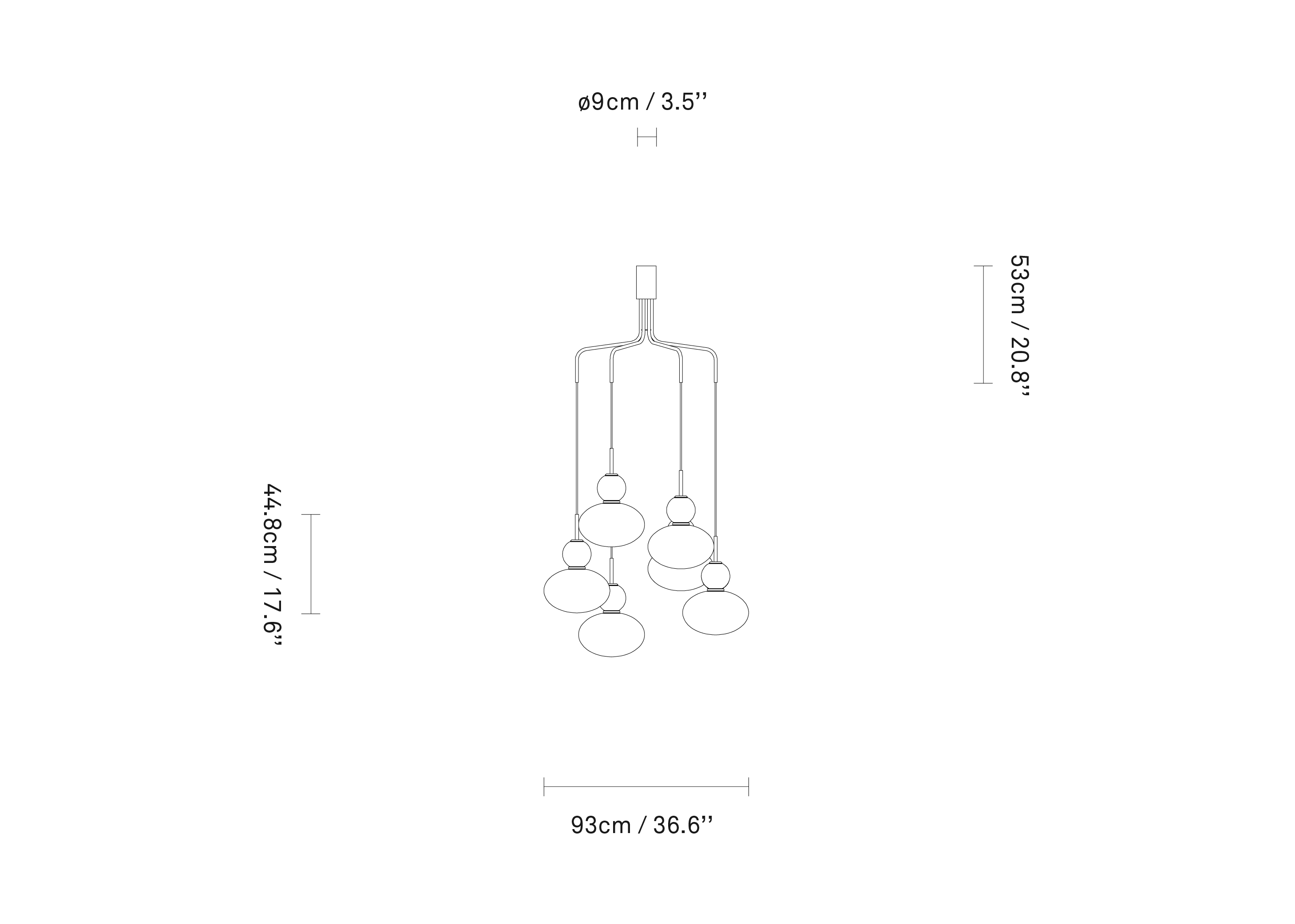 Rizzatto Cluster 6 er en stor og voluminøs lysekrone i en formation af 6 pendler. Klyngen er designet med 6 individuelle Rizzatto 32-pendler, der hænger fra solide metalstænger i en satin-messingfinish. Den lille baldakin skjuler ikke loftets stukdetaljer, og formationen på de enkelte pendler kan justeres i forskellige højder. Rizzatto Cluster 6 er et statementpiece, der kræver en vis højde til loftet.