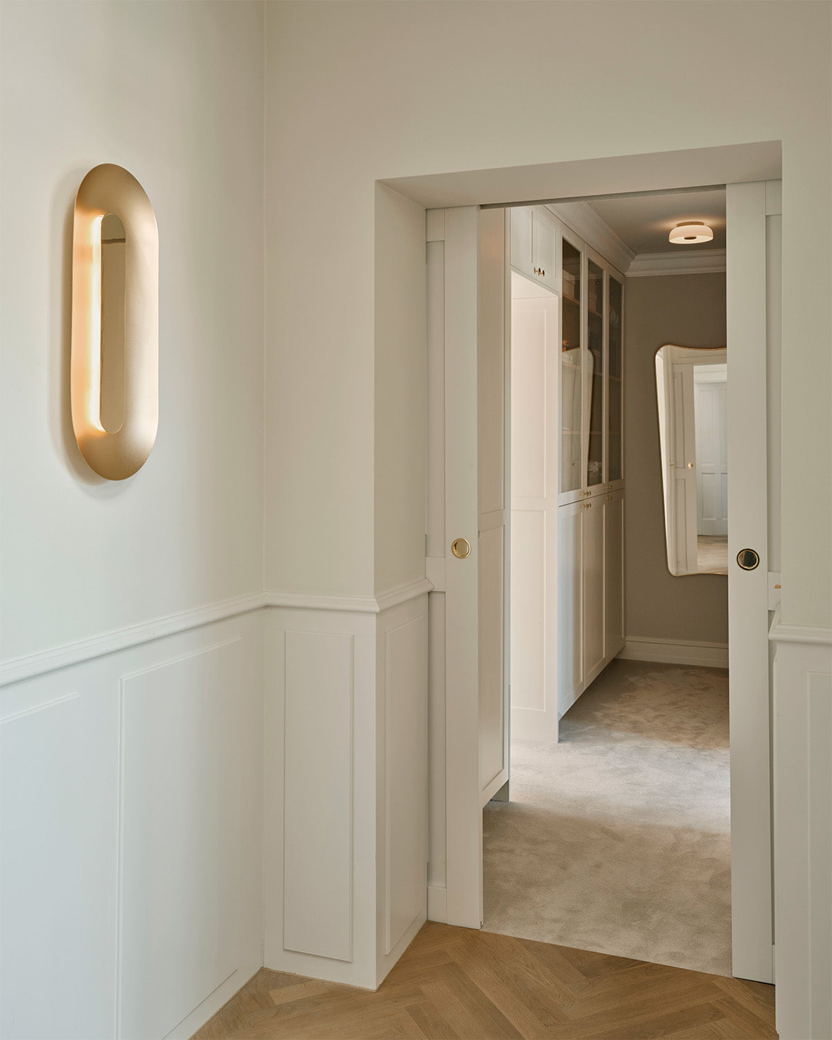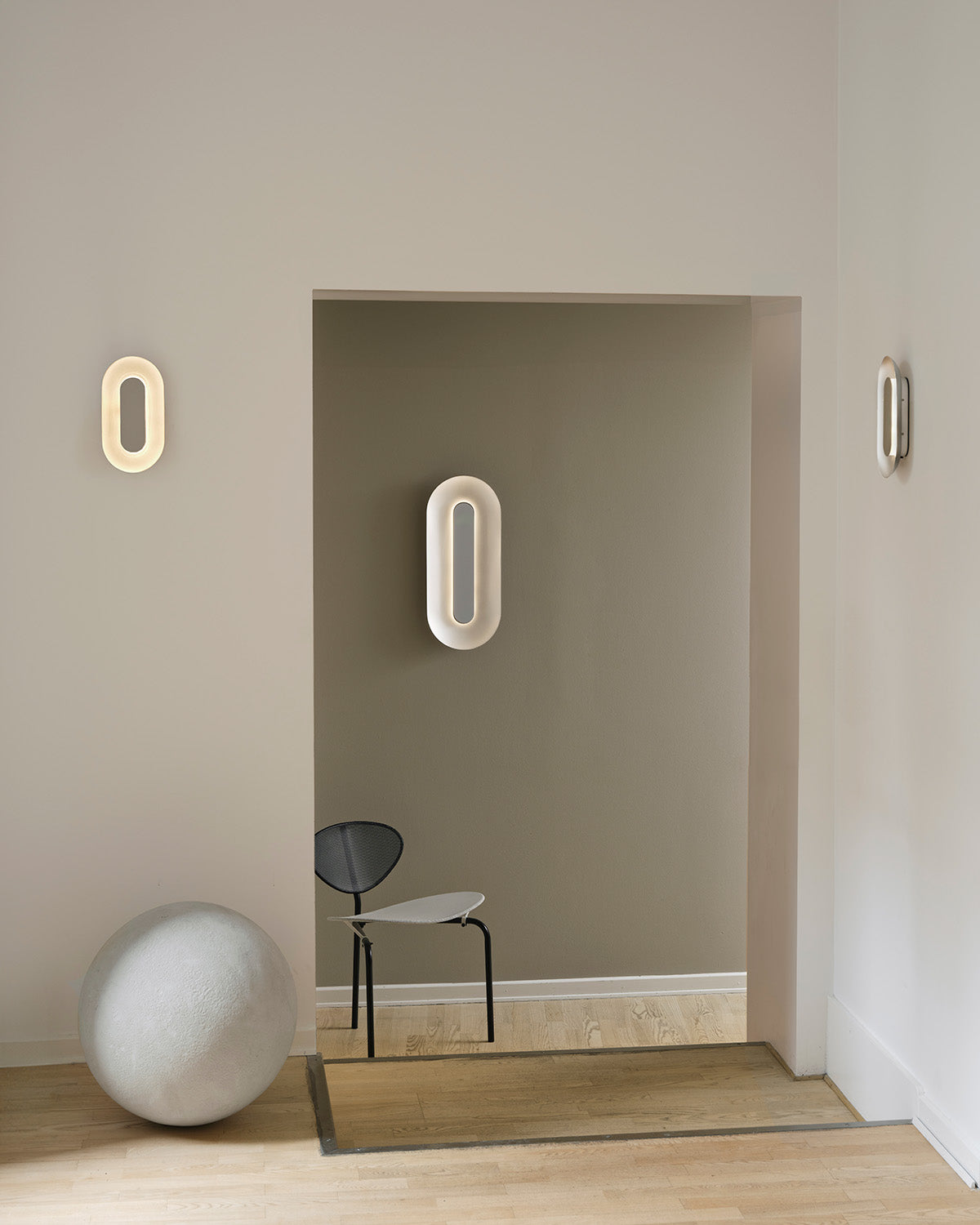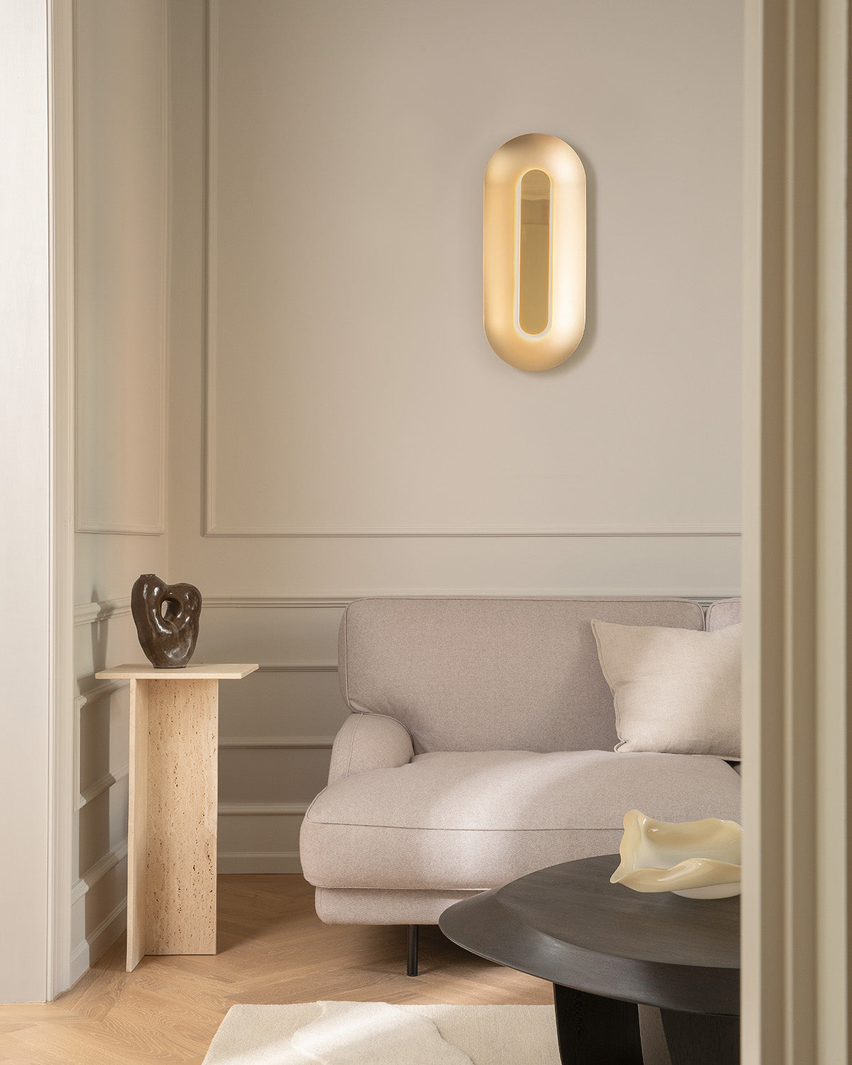 Sofistikeret, dekorativ væglampe med bløde kanter og et behageligt lys. Sasi væglampen består af en anodiseret aluminiumsramme i satin messing finish og en skærm i blankpoleret messing finish. Det integrerede LED-lys er placeret bag den polerede skærm, som reflekterer lyset i den ovale metalramme. Sasi Large væglampen fungerer både som dekorativt element og stemningsskabende belysning over fx sofaen.