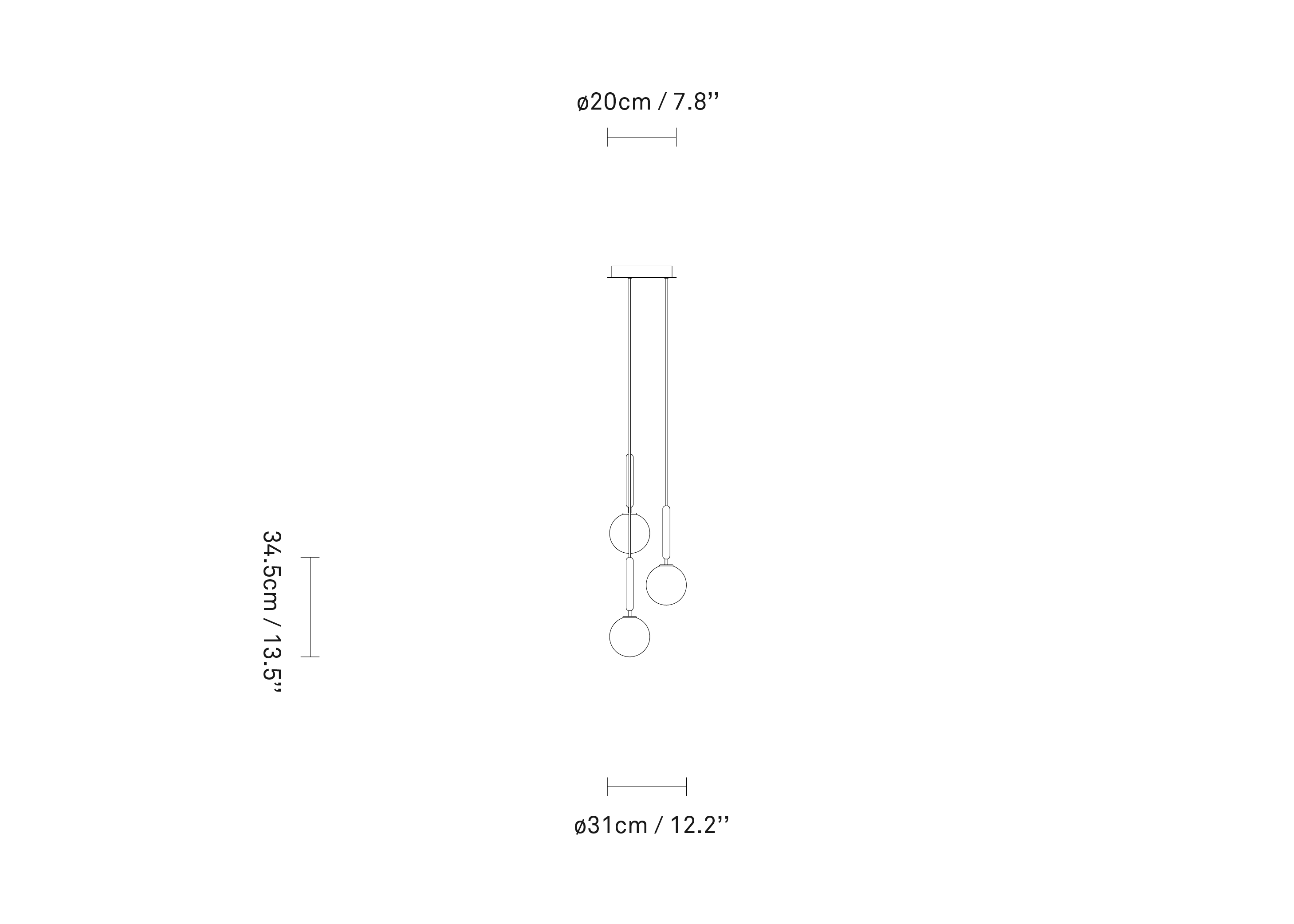 Miira 3 is a chandelier with 3 single pendants attached to a round ceiling plate in a multi-light formation, as the pendants can be adjusted to the desired height. The Miira 3 chandelier has a light and narrow silhouette, creating a floating appearance in the air.
